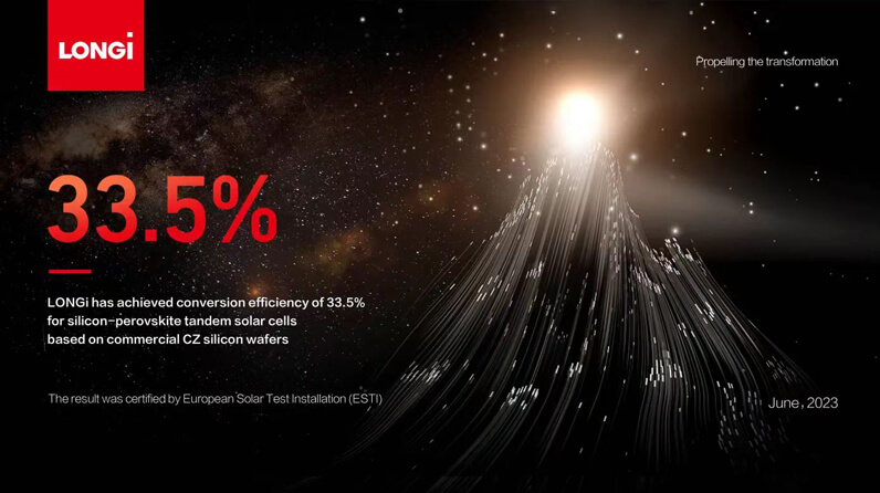 LONGi Green Energy has achieved a groundbreaking milestone in solar cell efficiency. Recently, at Intersolar Europe 2023, the company proudly announced a record-breaking 33.5% conversion efficiency for crystalline silicon-calcium titanite stacked cells on commercial-grade suede CZ wafers. This achievement has been certified by ESTI, a prestigious European solar testing institute, making it the highest efficiency ever recorded for this technology on commercial grade CZ wafers, setting a new world record.